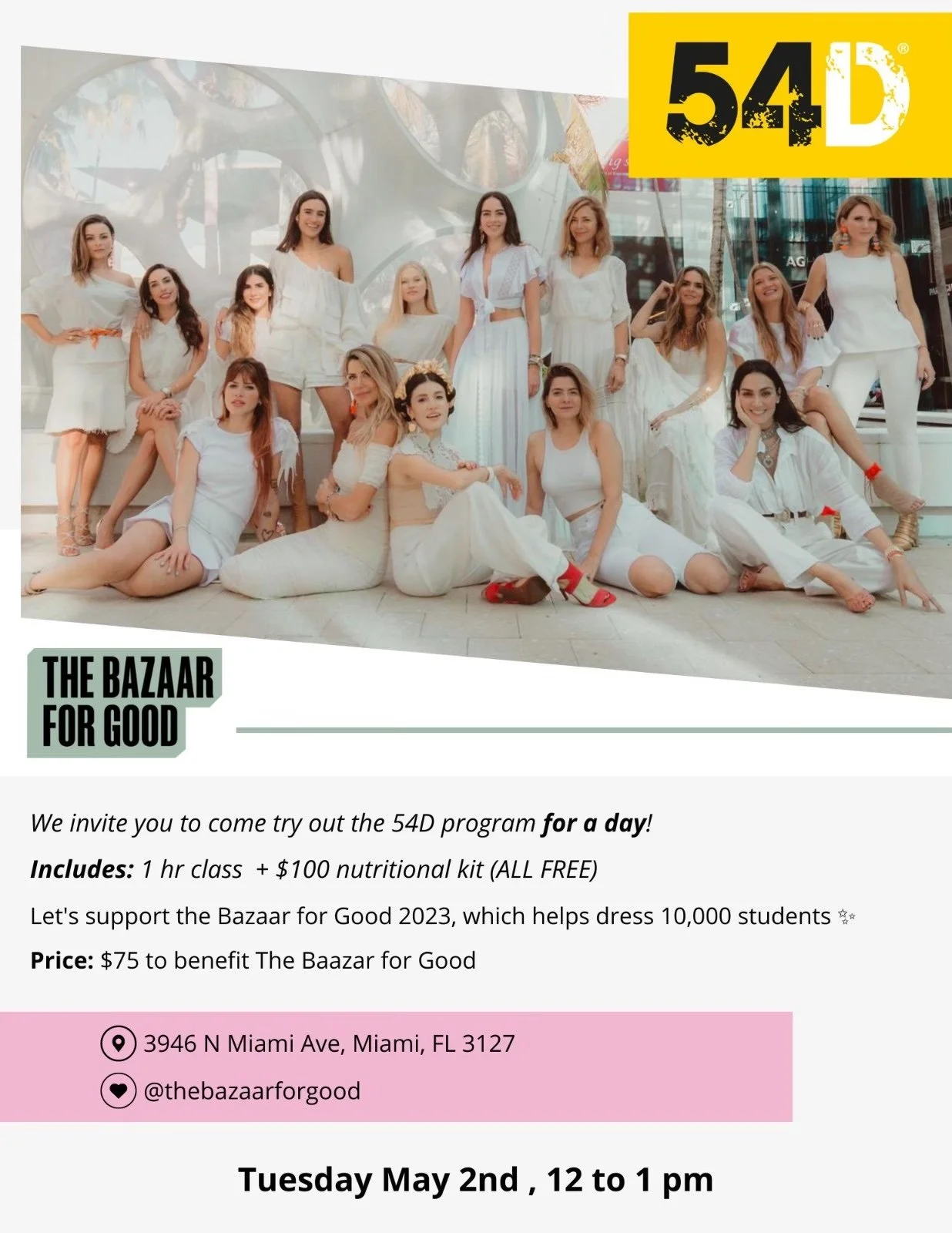 We invite you to come try out the 54D program for a day! Ticket price includes 1 hour class, $100 nutritional kit and a $75 donation to be benefit The Bazaar for Good.